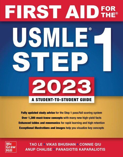 The First Aid 2023 book presents essential information about the most important test areas for USMLE exam testing through its high-yield topic organization. The manuscript features an optimized study structure that uses mnemonics together with diagrams and summary tables to present difficult concepts in simplified formats.